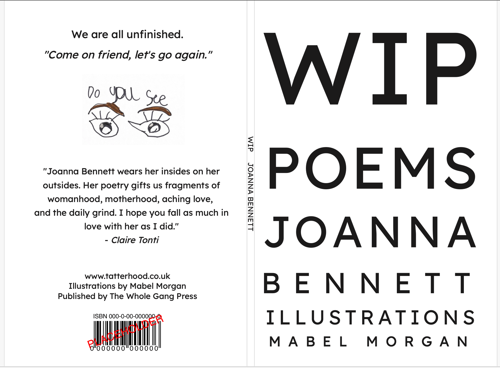 The cover for WIP is inspired by the Snellen eye chart, the standard tool for measuring visual acuity. Over the past four years, as I wrote the poems for this book, I slowly waved goodbye to all but the top line of the chart in my left eye and some areas of the chart for my right. But humans are amazing; over time, the brain learns to fill in some of the gaps, and we adapt.